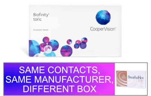 Sofmed Breathables XW Toric contact lenses are identical to Biofinity Toric contact lenses. Sofmed Breathables XW Toric contact lenses are manufactured by CooperVision.