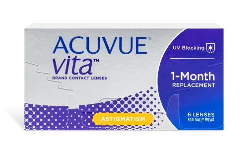 Look no further than ACUVUE® VITA® for Astigmatism brand contact lenses. HydraMax™ Technology helps maintain moisture and comfort throughout the month while UV protection keeps your eyes safe from harmful UVA and UVB rays.