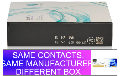 Convenient comfortable FRESH DAY® Multifocal 90 pack contact lenses at an affordable price. FRESH DAY® Made from water-loving silicone hydrogel material FRESH DAY® contact lenses stay moist and comfortable all day long. Plus higher levels of oxygen flow freely through the lens for whiter brighter eyes. These contact lenses also feature a UVA/UVB blocker to further protect your eyes from the sun.