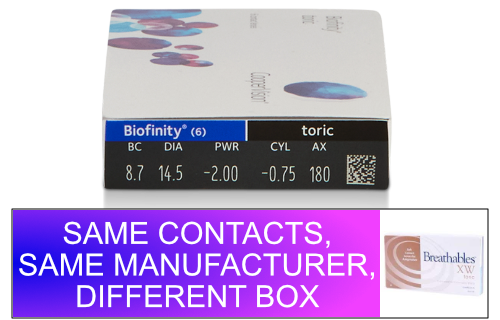 Sofmed Breathables XW Toric contact lenses are identical to Biofinity Toric contact lenses. Sofmed Breathables XW Toric contact lenses are manufactured by CooperVision.