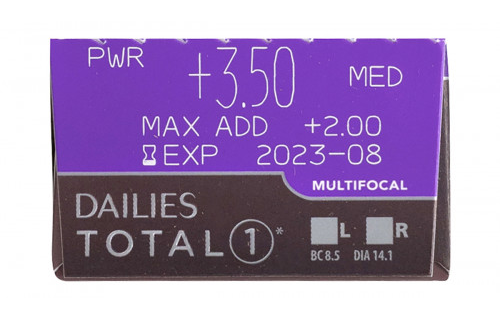 Dailies Total1® Multifocal 30 Pack contact lenses are designed for people with presbyopia and are intended to be used on a daily disposable basis. The contact lenses are available with a power range of – 6.00 to + 3.00D and three ADD powers (Low Med High).
